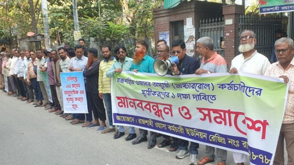 নিজস্ব প্রতিবেদক: হাইকোর্টের রায়ের আলোকে দৈনিক মজুরী ভিত্তিক কর্মচারীদের চাকরী স্থায়ীকরণের দাবিতে মানববন্ধন করেছে রাজশাহী ওয়াসা কর্মচারী ইউনিয়ন। মঙ্গলবার সকাল ১০টায় মহানগরীর উপশহরস্থ ওয়াসা ভবনের সামনে অনুষ্ঠিত মানববন্ধনে সকল স্থায়ী